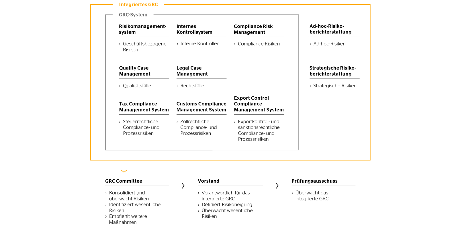 Im Rahmen des GRC-Systems sind alle Komponenten der Risikoberichterstattung sowie der Wirksamkeitsprüfung des internen Kontrollsystems integriert. Die Identifizierung, die Bewertung und die Berichterstattung von Risiken erfolgen dabei auf der organisatorischen Ebene, die auch für die Steuerung der identifizierten Risiken verantwortlich ist. Über einen mehrstufigen Bewertungs- und Reviewprozess werden die übergeordneten organisatorischen Einheiten ebenfalls eingebunden. Somit umfasst das GRC-System alle Berichtsebenen, von der Gesellschafts- bis hin zur obersten Konzernebene.